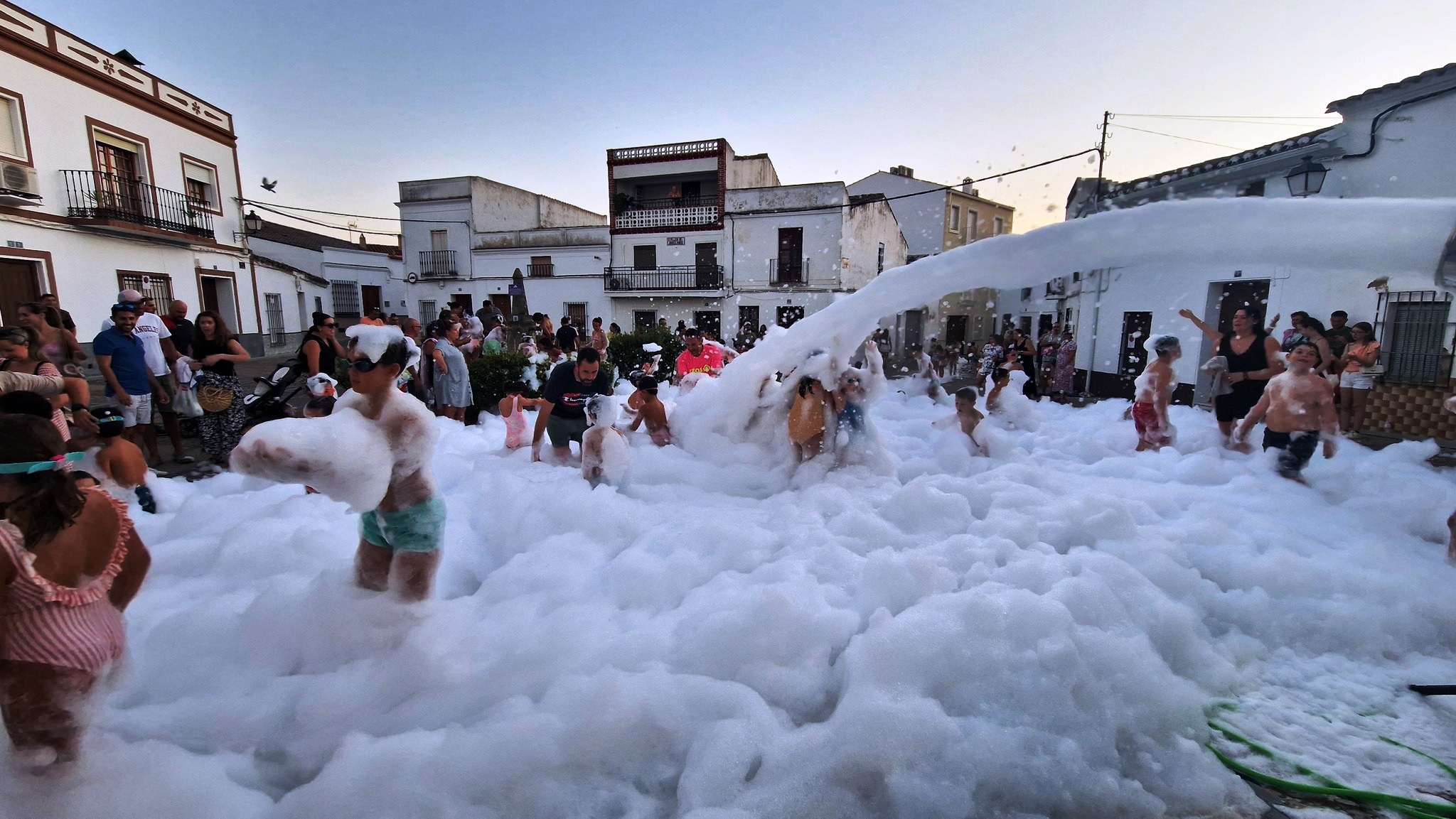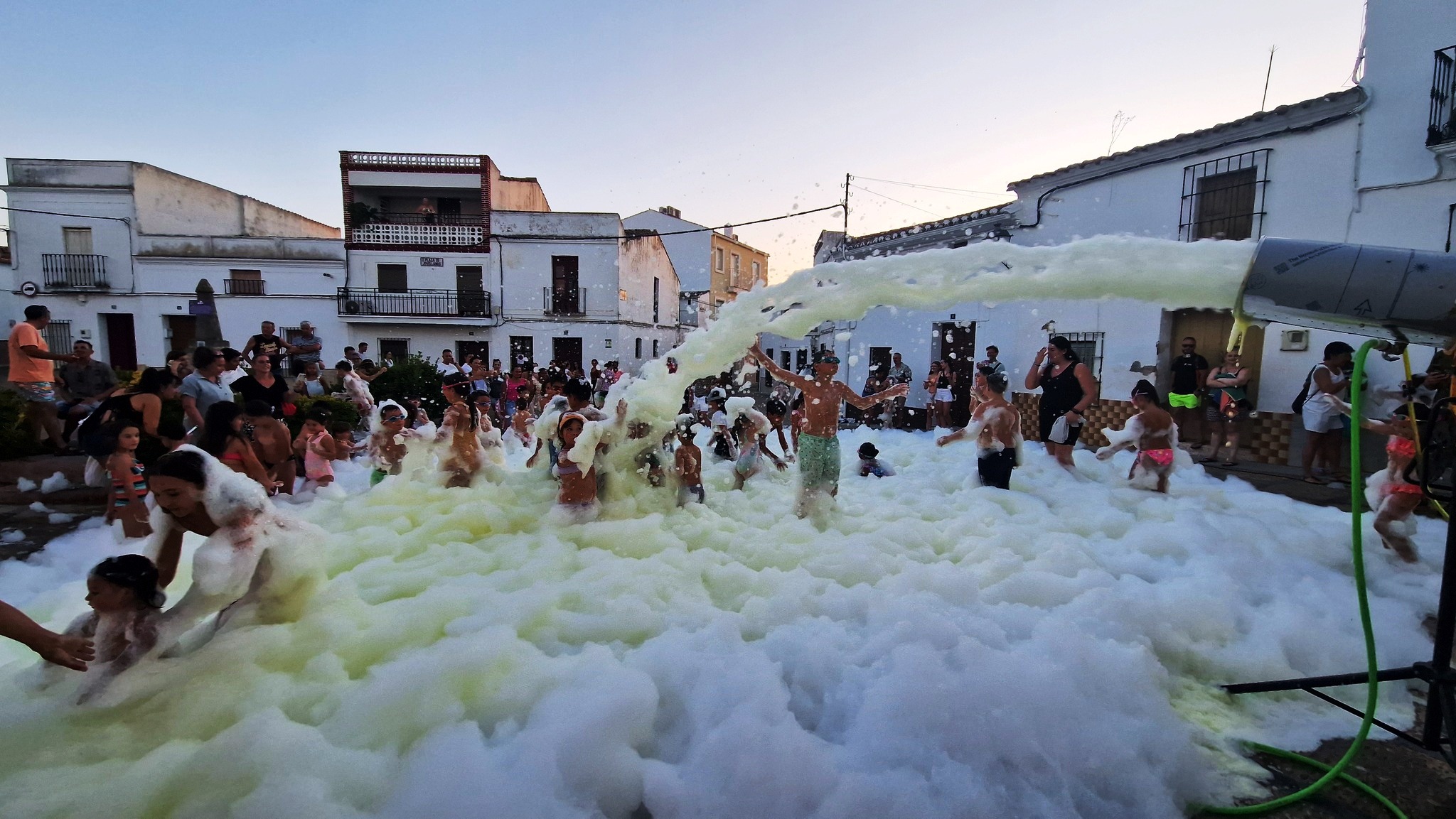 chicos y mayores en esta fiesta de la espuma organizada por la Asociación