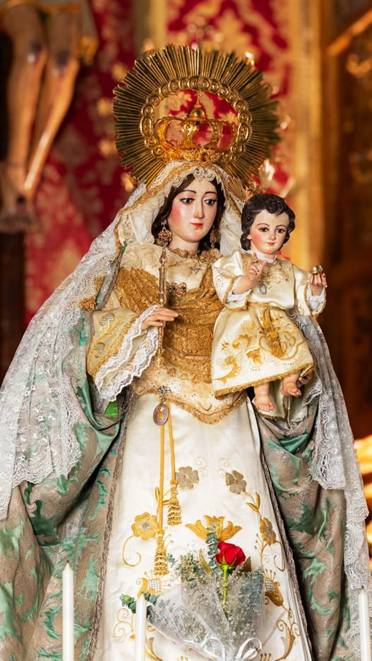 Portando un antiguo manto de damasco de oro sobre tisú. El Bendito Niño Jesús luce como hace décadas, una túnica de seda roja con dibujos florales pintado sobre ella.
